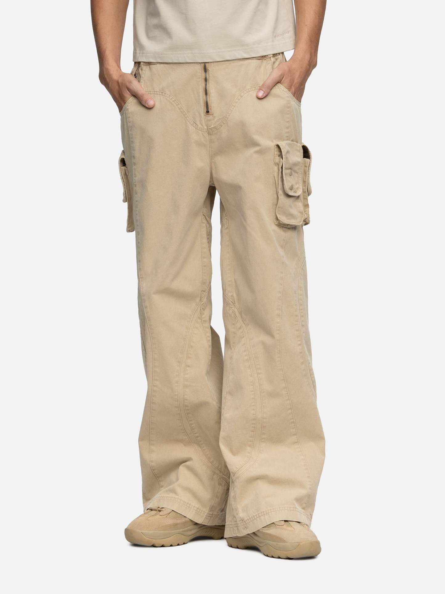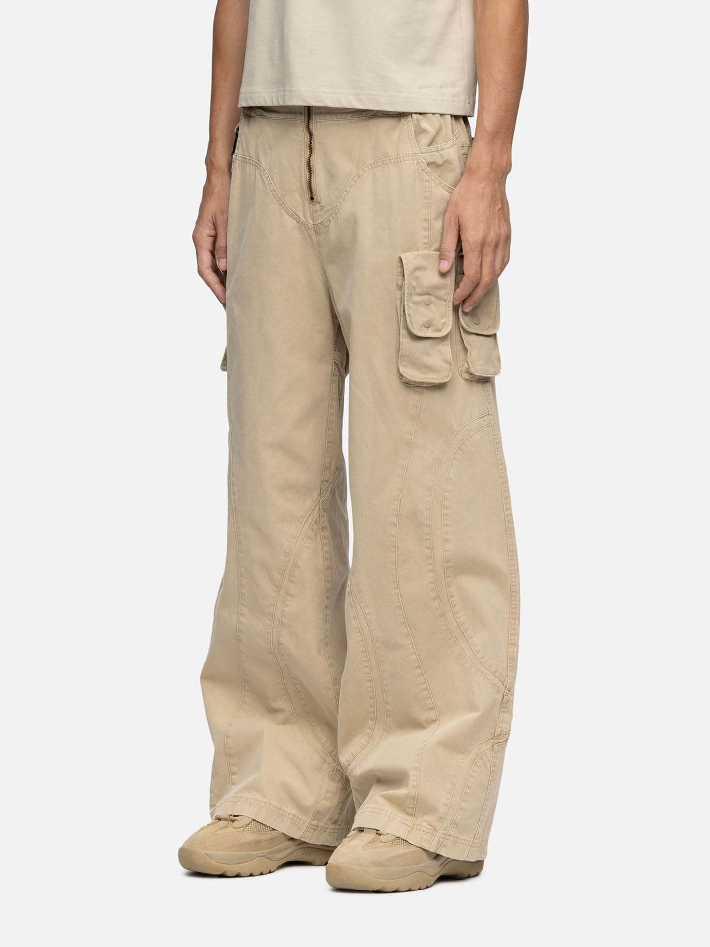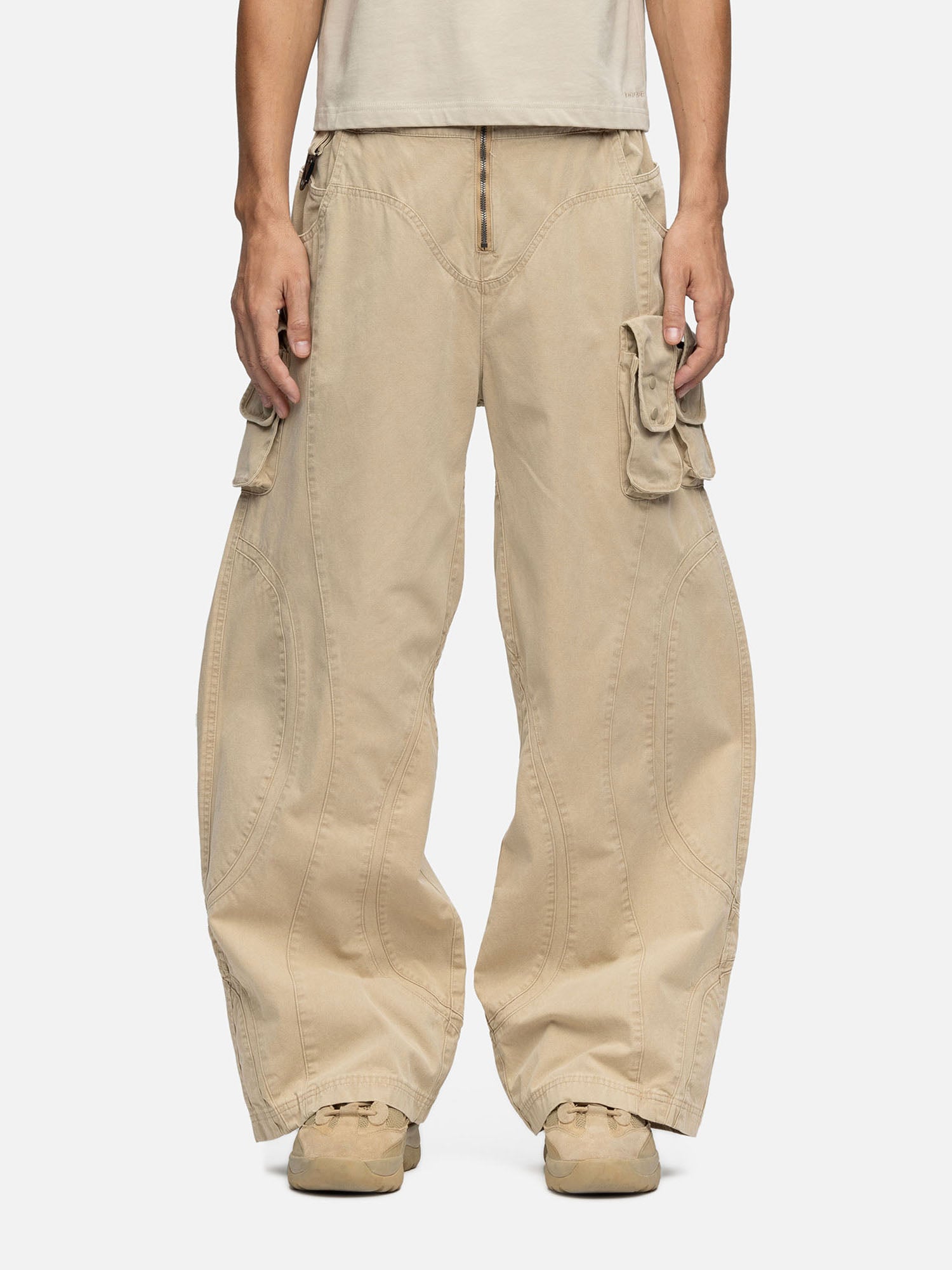 Crafted from plain-weave cotton, the W6 Cargo features a curvy cutting lines design, a buckle on the waist, with 3 patched bellow pockets on the sides, and curved inset coin pockets on both sides. Finishing off with baggy straight-leg openings.