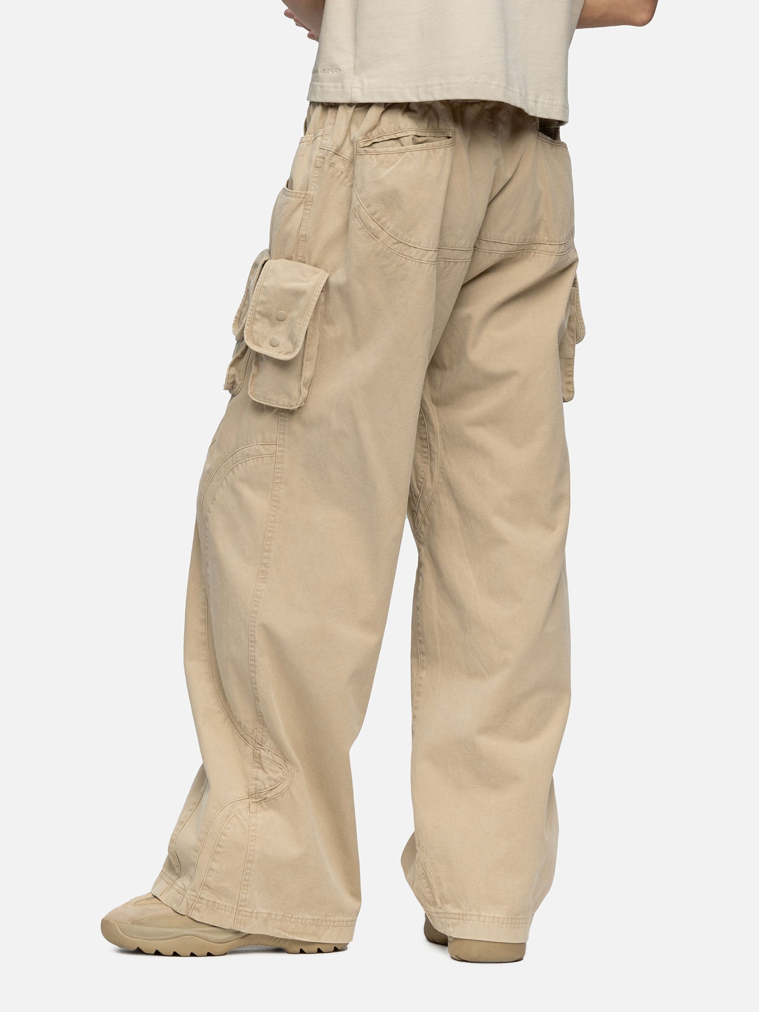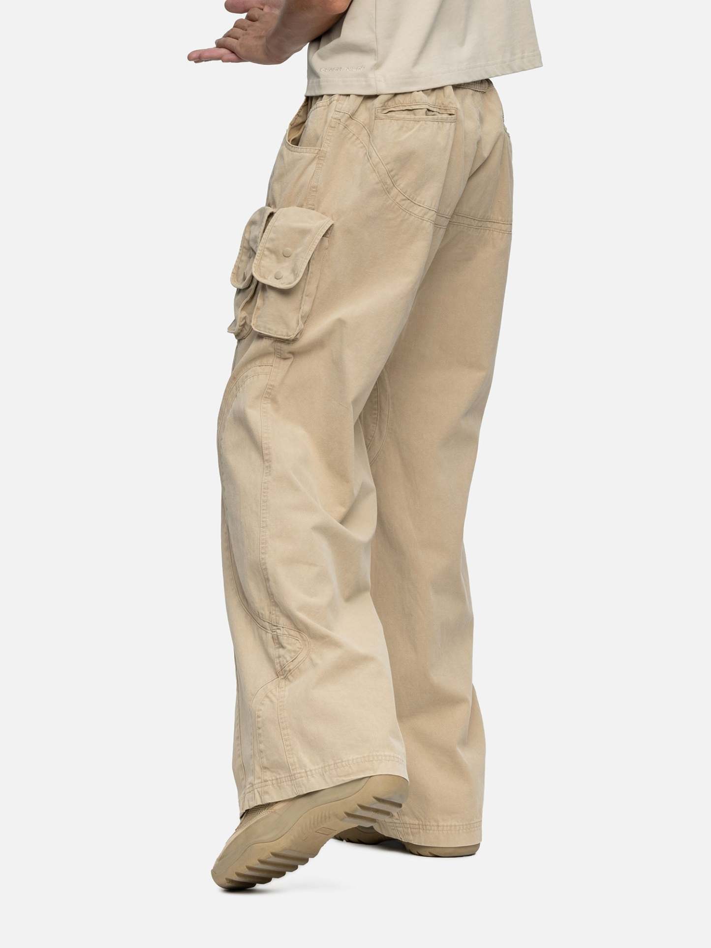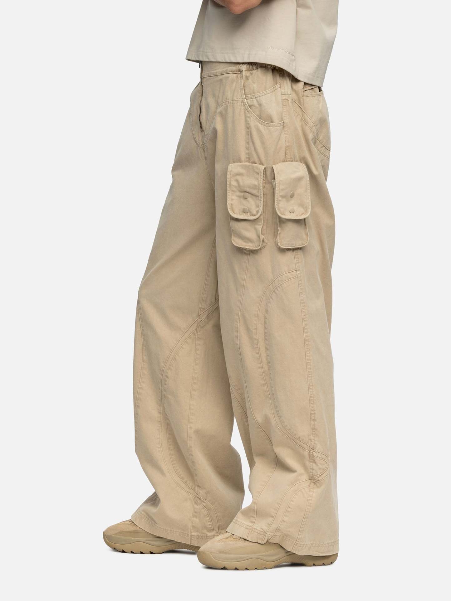 Crafted from plain-weave cotton, the W6 Cargo features a curvy cutting lines design, a buckle on the waist, with 3 patched bellow pockets on the sides, and curved inset coin pockets on both sides. Finishing off with baggy straight-leg openings.